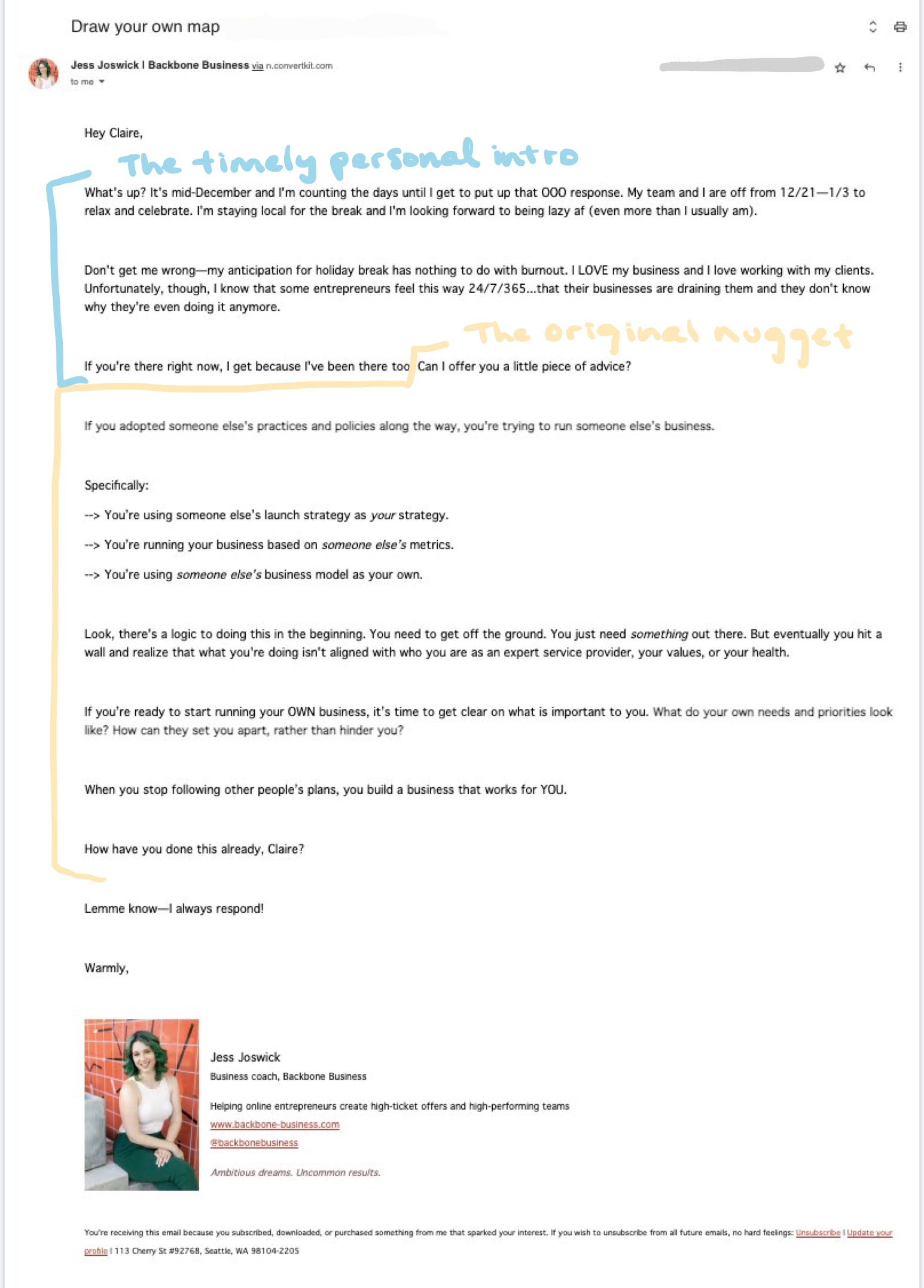 She picks a caption that feels relevant to conversations she wants to have with her audience right now, writes up a timely intro for it, like a personal story or something related to a current holiday or event, and ties them together to make a newsletter email.